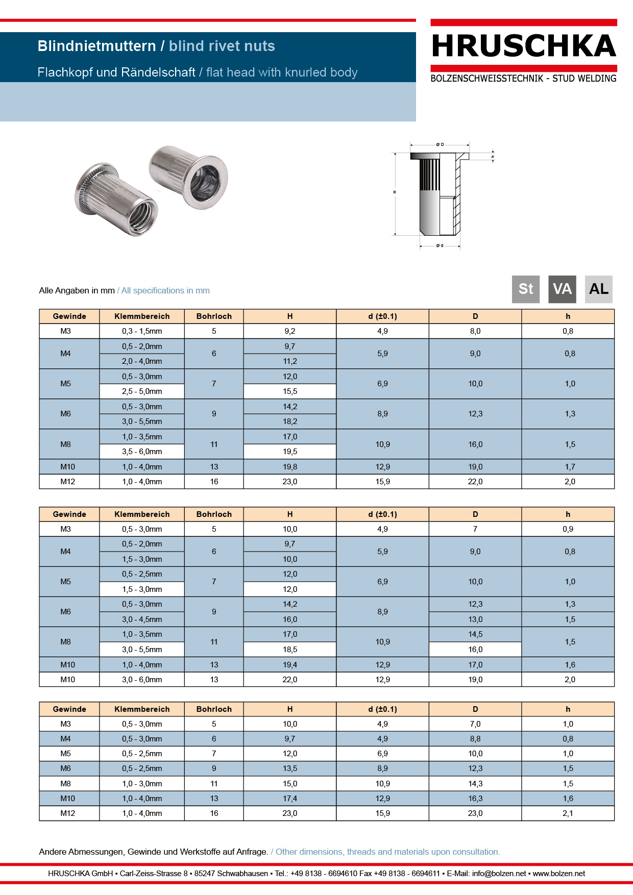 | Bezeichnung | Blindnietmutter aus Edelstahl M 3x20 mit Flachkopf und Rändelschaft KLB: 0,3-2,0 |