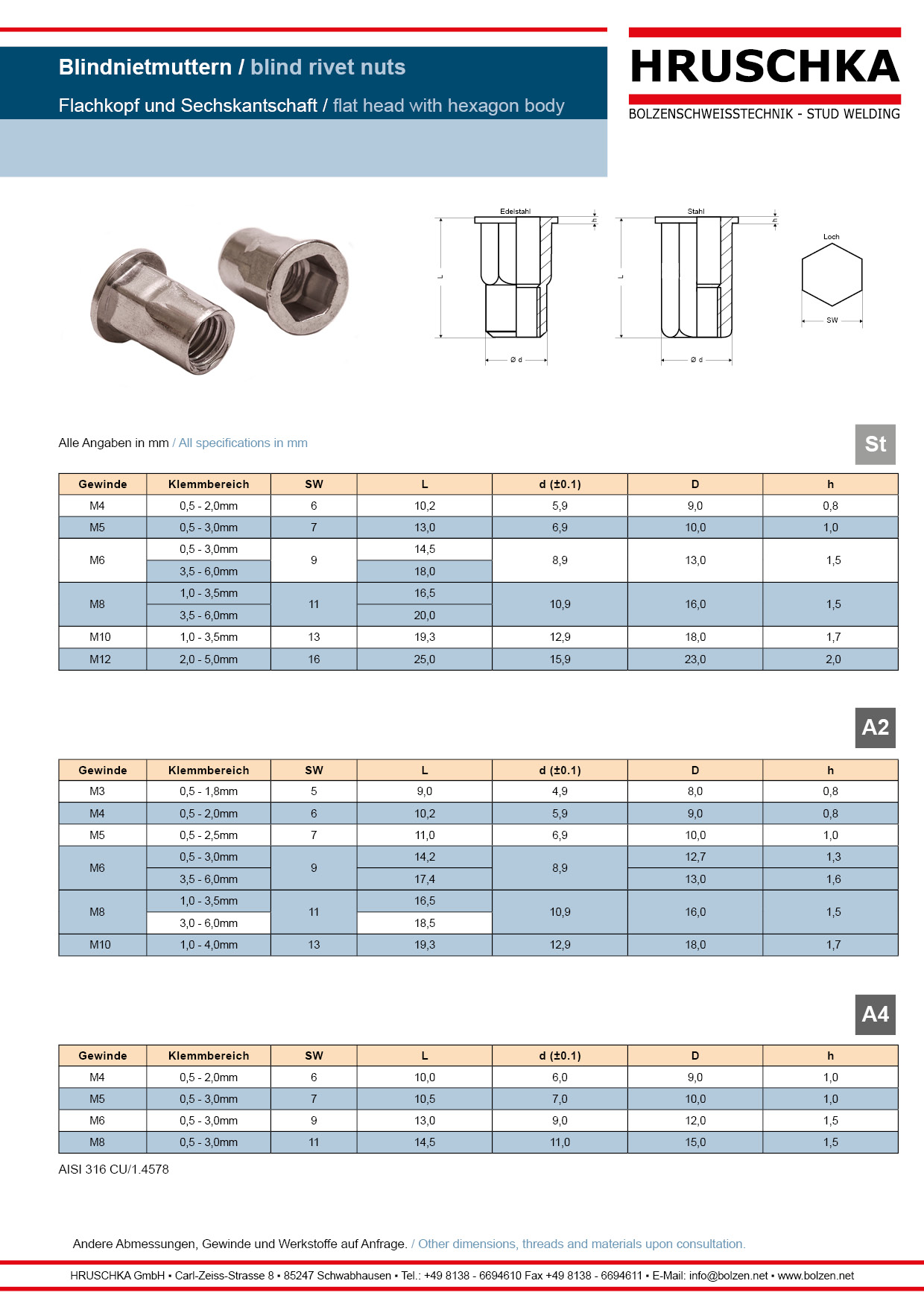 | Bezeichnung | Blindnietmutter aus Edelstahl M 5x30 mit Flachkopf und Sechskantschaft KLB: 0,5-3,0 |