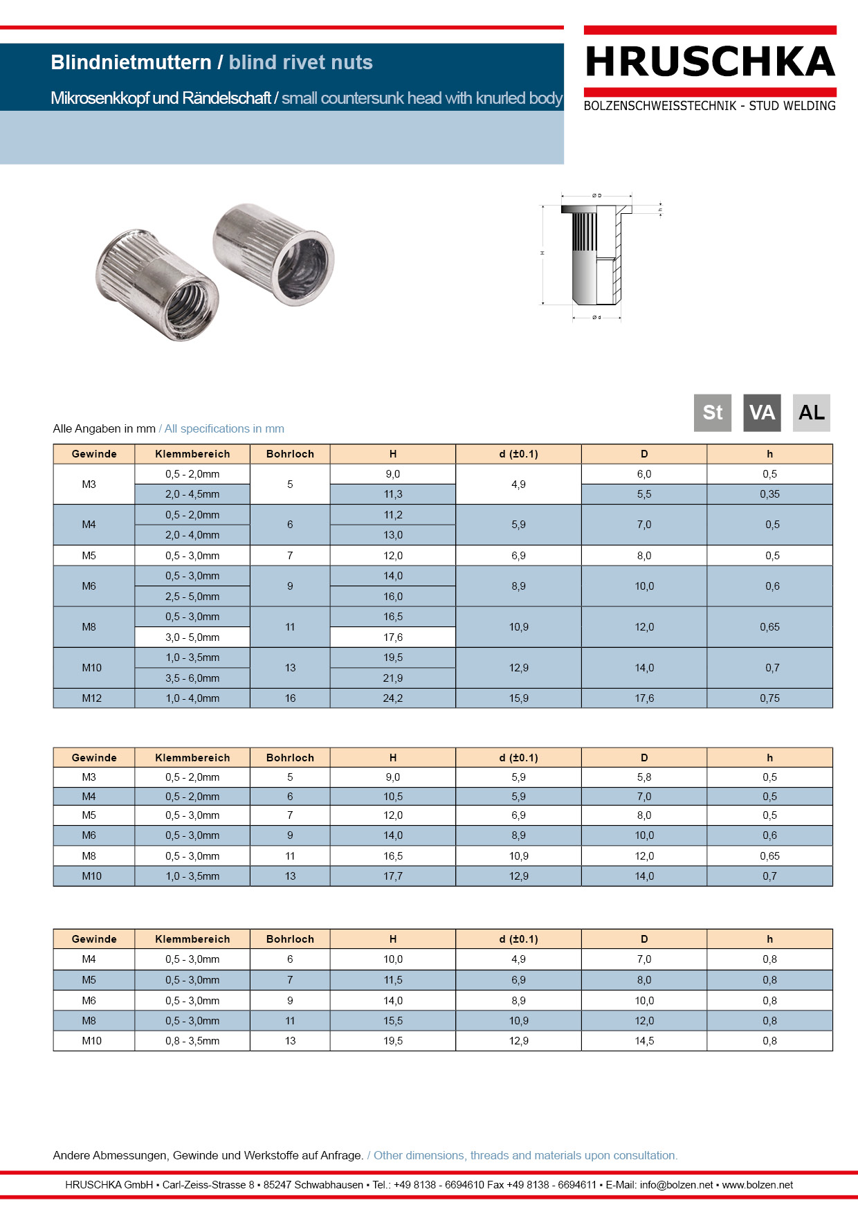 | Bezeichnung | Blindnietmutter aus Edelstahl M 8x60 mit kl. Senkkopf und Rändelschaft KLB: 3,5-6,0 |